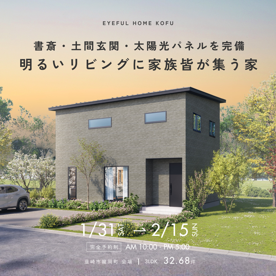 【韮崎市龍岡町会場】書斎・土間玄関・太陽光パネルを完備 明るいリビングに家族皆が集う家《完成見学会》
